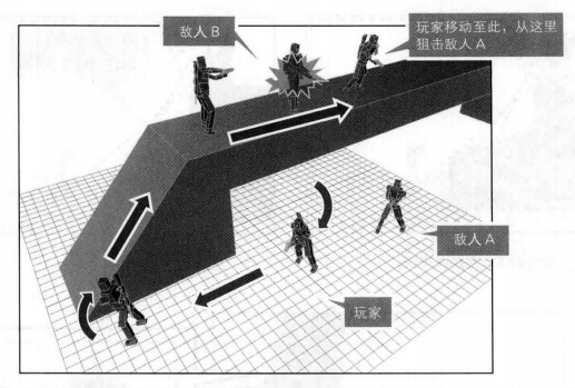 大批TPS · FPS游戏的关卡设计都开始采用“立体构造”。一般说来,枪战中位于高处的人处于优势。居高临下的人可以借助蹲姿或卧姿隔着掩体瞄准敌人,从而降低自己的目标面积(子弹可命中的面积)。
