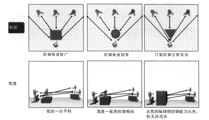 障碍物的形状基本上为立方体。虽然圆柱体的障碍物在技术上可行,但没有棱角的形状很难完全遮挡隐蔽者的身体。另外,“高度”也有着重要意义,只有高度足以遮挡弹道的物体才能称之为掩体。而且只要掩体不超过一定高度,就可供玩家探身射击或者攀爬翻越。很多游戏中将这些高度按 照功能(动作)的不同在关卡设计中统一管理。